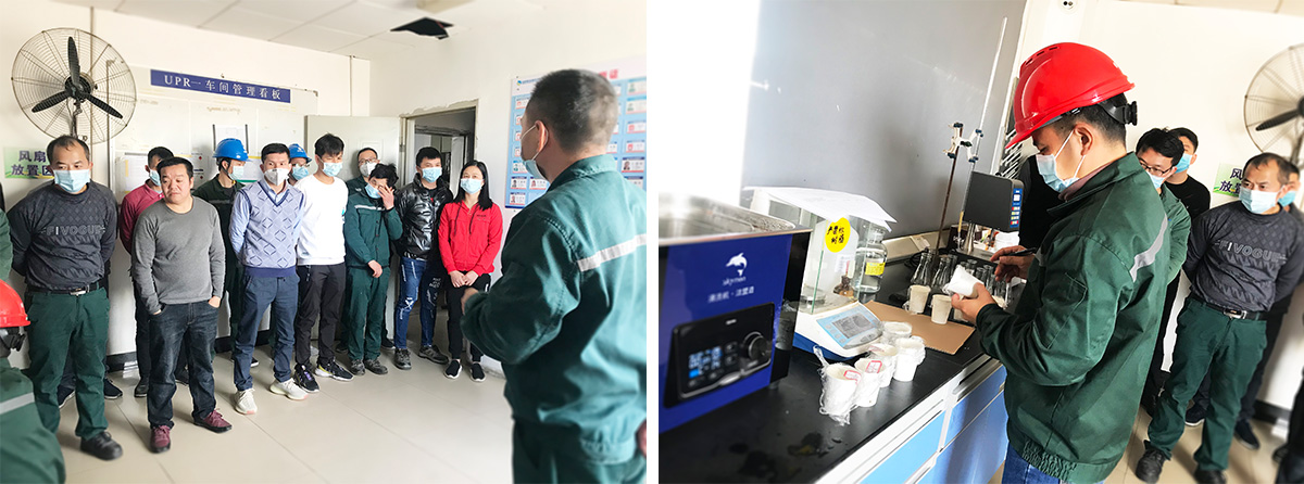 本次活动由技术部孔总监和质检部邹经理带领,组织UPR操作员、质检部、技术部全体人员共同参与。依旧考察两个重点项目:一、聚酯的锥板粘度的测试;二、聚酯的酸值的测试。经过两期的指导和操作实践培养,操作员对仪器和操作步骤及相关知识已有一定认知,不复第一次的被动和生涩。到场宣布注意事项后,已然可以有序、自主、分批的展开测试活动。