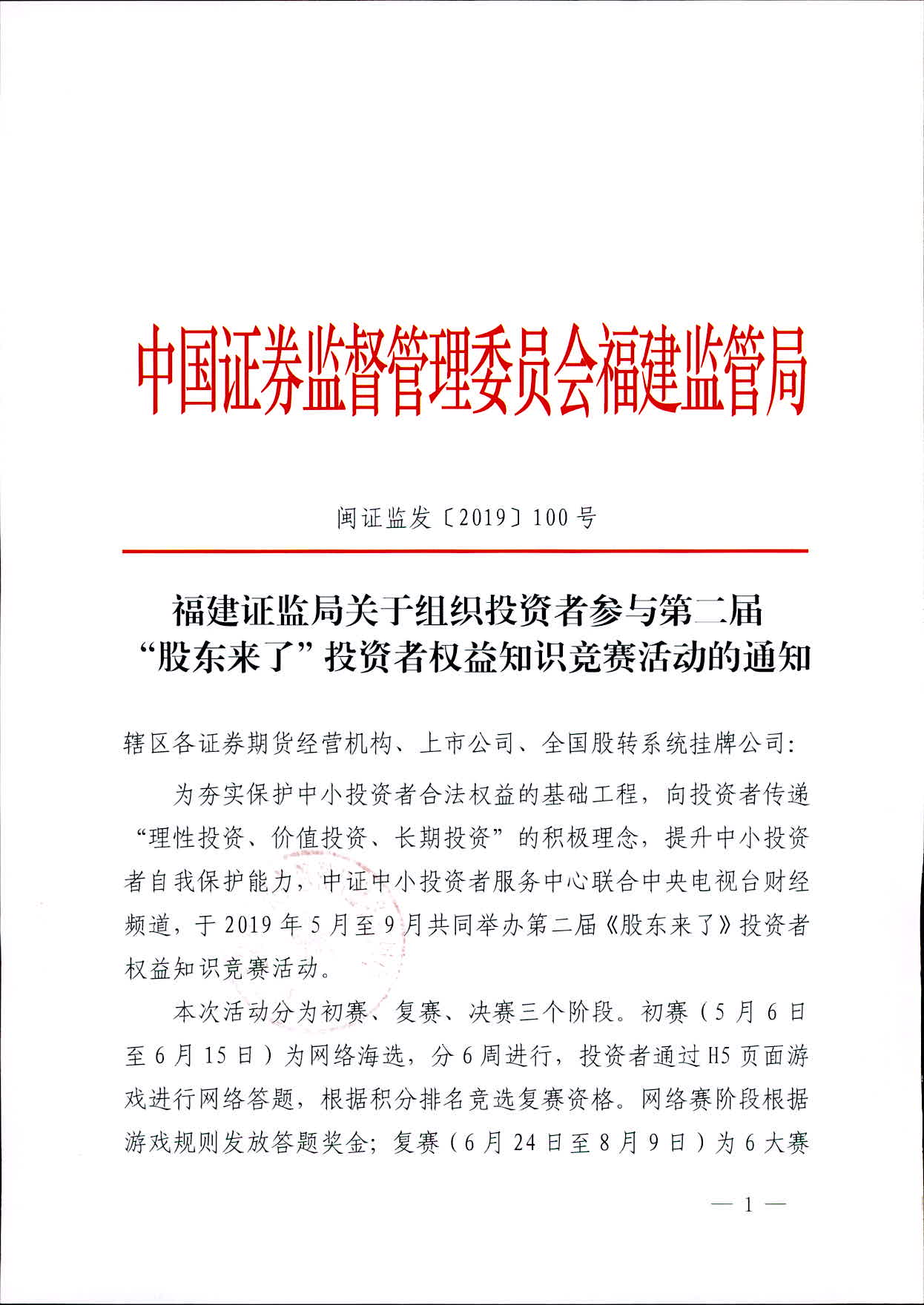 福建证监局关于组织投资者参与第二届“股东来了”投资者权益知识竞赛活动的通知